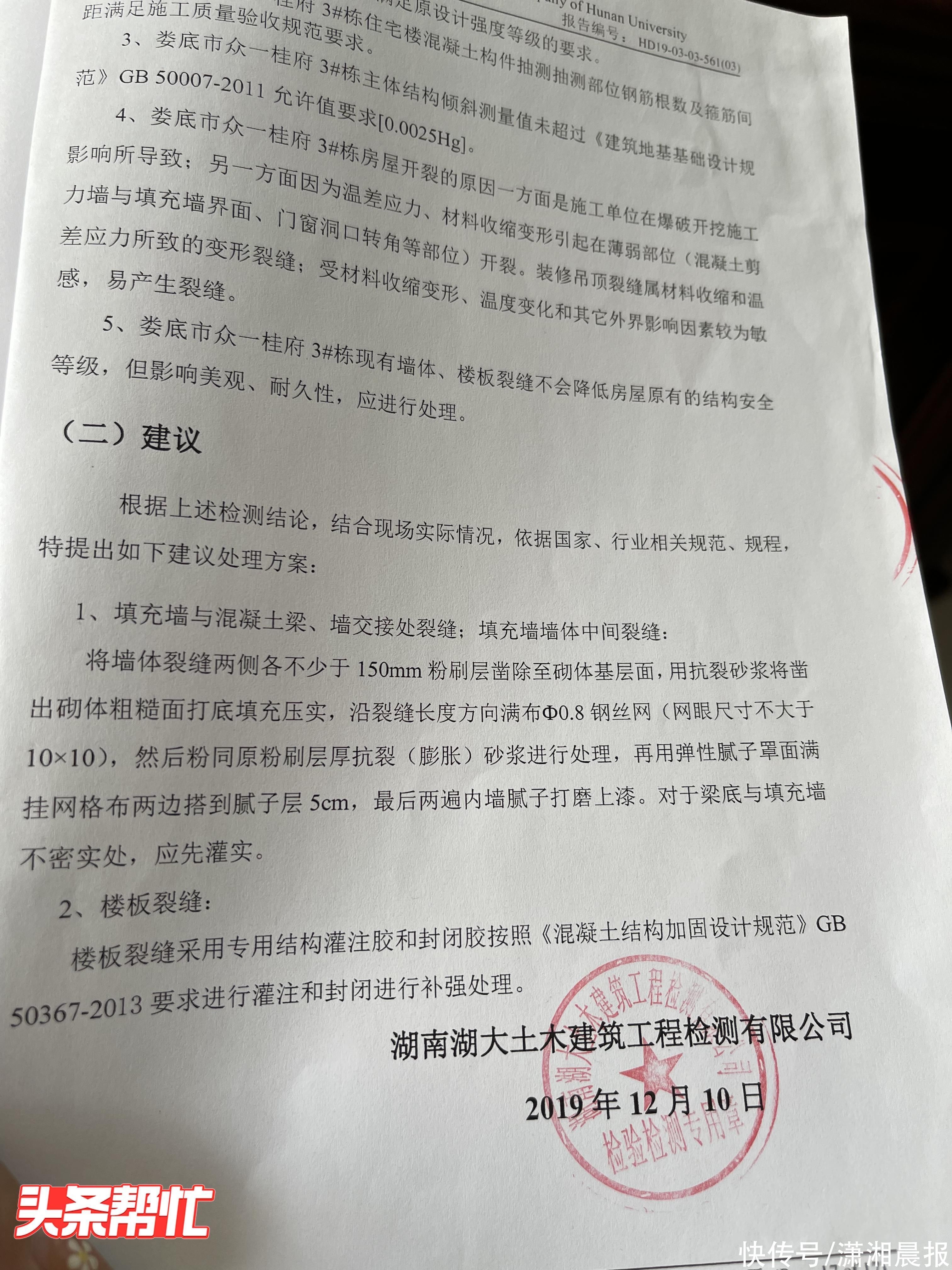 据李娟出示的,落款为湖南湖大土木建筑工程检测有限公司的报告显示,“娄底市众一桂府3#栋房屋开裂的原因一方面是施工单位在爆破开挖施工影响所导致,另一方面是温差应力、材料收缩变形引起在薄弱部位(混凝土剪力墙与填充墙界面、门窗洞口转角等部位)开裂……”